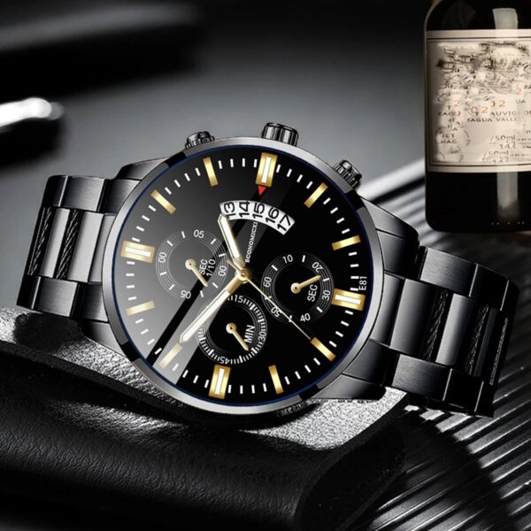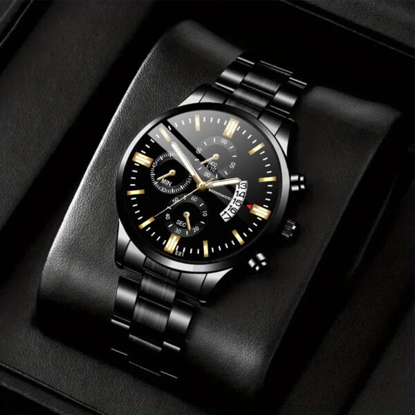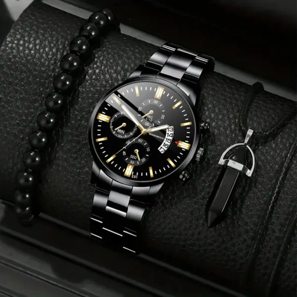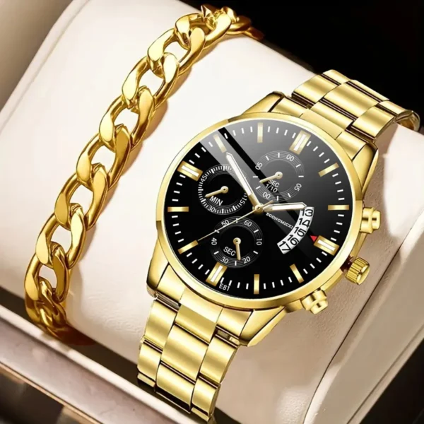 Upgrade your accessory collection with this 2-piece men’s watch and bracelet set. Designed for business and casual wear, this stylish quartz watch features a three-eyes calendar, luminous display, and durable alloy band — paired with a sleek bracelet to complete your look.
