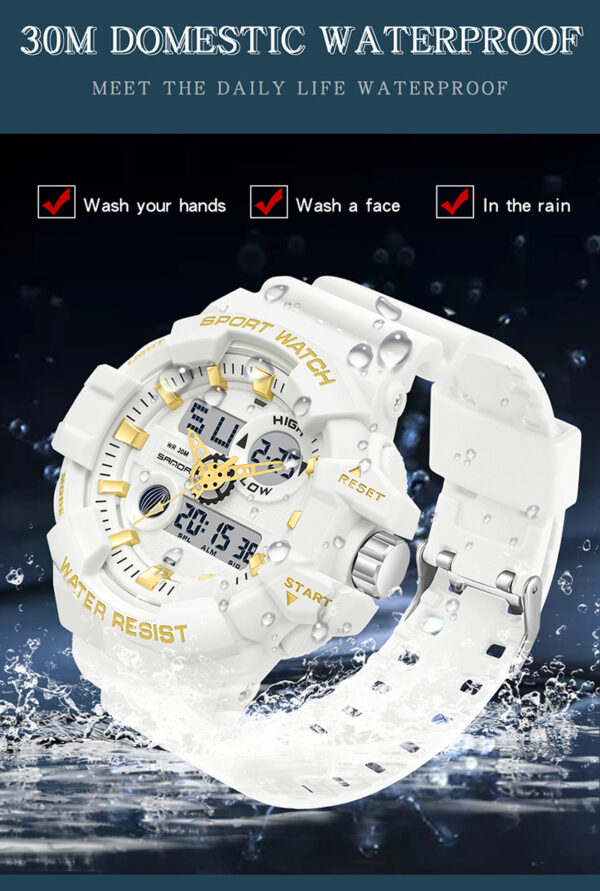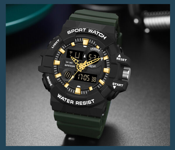 The SANDA-60210 Luxury Sports Watch is designed for men who want a perfect balance of style, durability, and performance. Featuring a dual display (analog + digital), shock resistance, and 50M waterproofing, this watch is ideal for outdoor sports, business, and everyday wear.